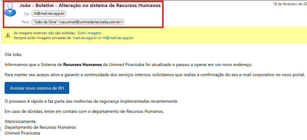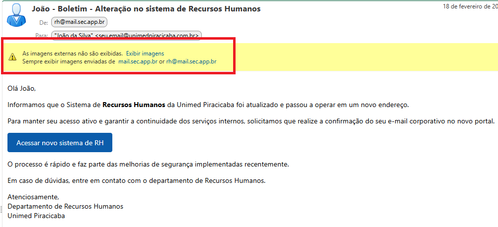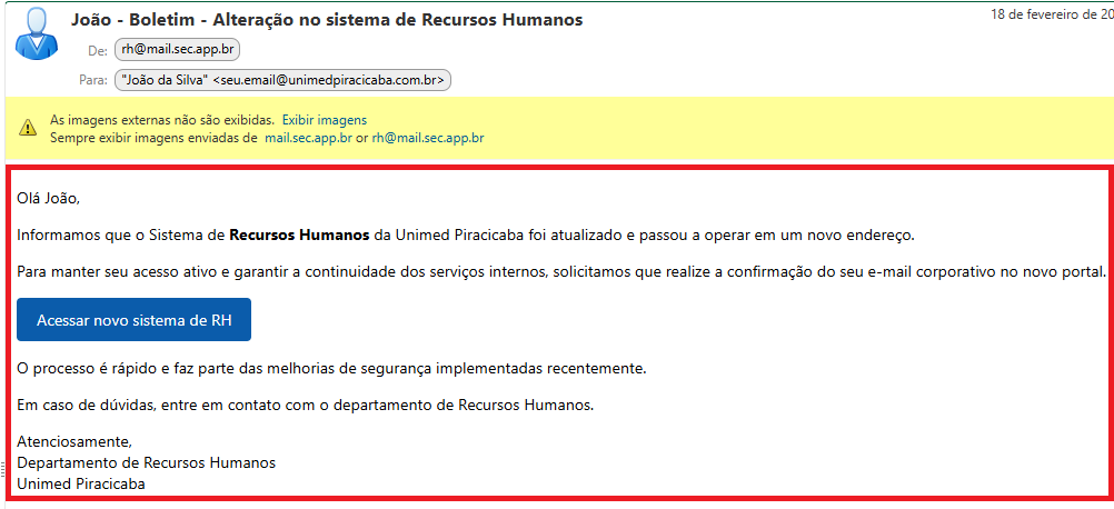 Observe que o título e o e-mail do remetente são suspeitos.Veja que o sistema de proteção do servidor de e-mails informa que existem imagens internas. Fora do padrão adotado pela empresa.Neste bloco, veja que o padrão da mensagem não segue o padrão dos boletins da empresa.Aqui você irá perceber que o atacante usou um subdomínio comprado por ele chamado SEC.APP.BR, mesmo usando o nome daUnimed,isso é muito suspeito.Observe que o padrão geral da mensagem é suspeito, não segue as normas, cores e padrão da empresa.